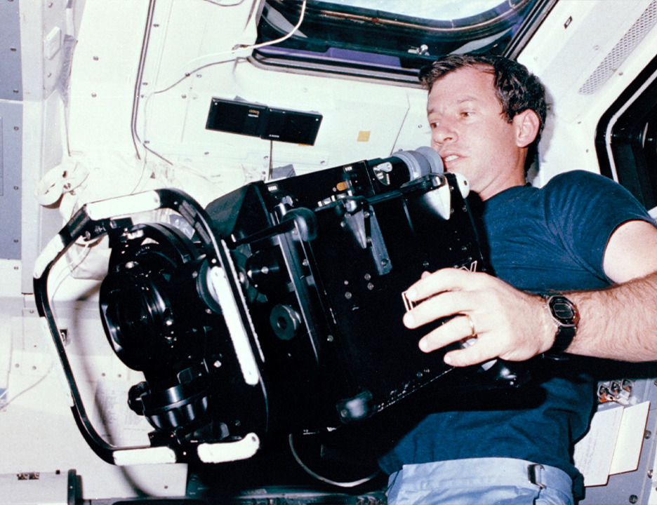 Terry Hart ’68 serves as cinematographer for the IMAX documentary "The Dream Is Alive" aboard Challenger, using an improvised in-space “dark room,” and operates the shuttle’s robotic arm to capture the Solar Max satellite for repair.
