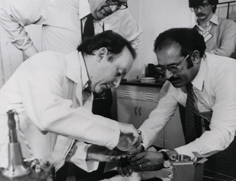 Professor Mohamed el-Aasser (front right) and collaborators prepare the first chemical reaction experiment in space for the Columbia Shuttle mission, producing perfectly spherical monodisperse polymer particles under microgravity—the first manufactured products from space.