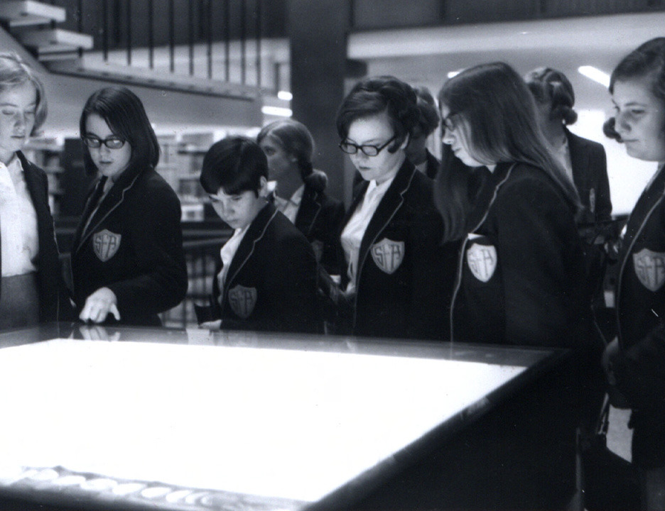 Professors Charles B. Sclar and Joseph I. Goldstein analyze lunar samples from Apollo 11 and 12, contributing to evidence that the moon’s craters were formed by meteor impacts rather than volcanic activity. A public viewing of lunar rocks draws 5,500 visitors, such as these students from St. Francis Academy, to campus for a glimpse of material from the Sea of Tranquility.