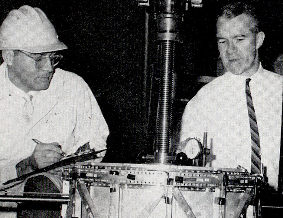 Fritz Engineering Laboratory conducts stress tests on the structural frame of AT&T's Telstar, the first U.S. communications satellite. Pictured: Roger Slutter (left), assistant engineer of tests, and Lynn S. Beedle, a legend in civil engineering research at Lehigh and director of Fritz Lab during the project.